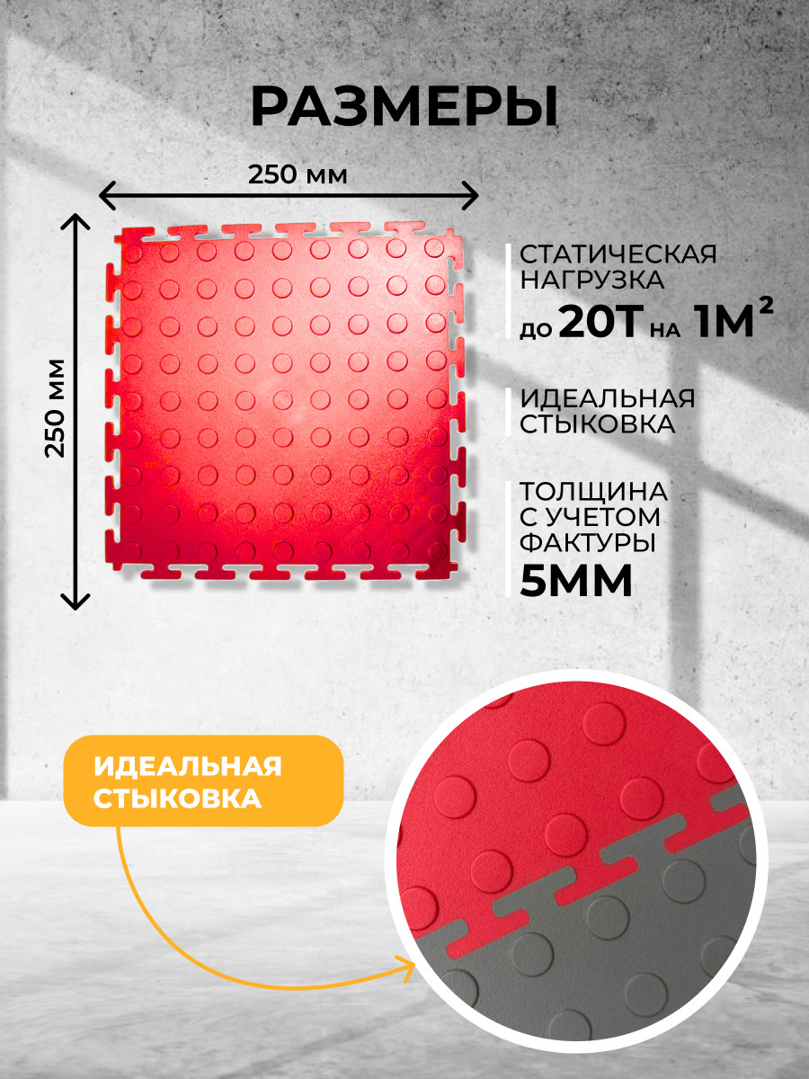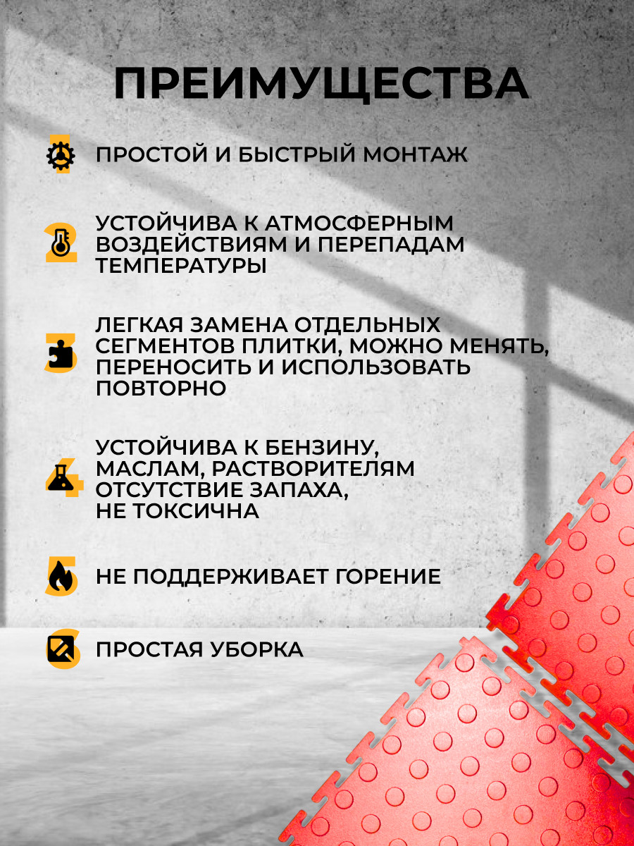 Модульное напольное покрытие разработано для быстрого и эффективного решения задачи по устройству надежного напольного покрытия для коммерческих и промышленных помещений с высокой степенью нагрузки. Модульные покрытия представляют собой плитки из прочного, химически инертного, устойчивого к маслам и бензину, негорючего ПВХ. Толщина модуля 5 мм в сочетании с высокой прочностью материала обеспечивают высокую надежность и износостойкость модульного покрытия. Модульное покрытие идеально для зон с высокой нагрузкой, таких как промышленные и складские помещения. Модульное напольное покрытие способно выдержать не только перемещения тележек и рохлей, но и движение тяжелых станков и грузов путем перекатывания на подкладных стальных вальцах, а также больших погрузчиков на шипованной резине.